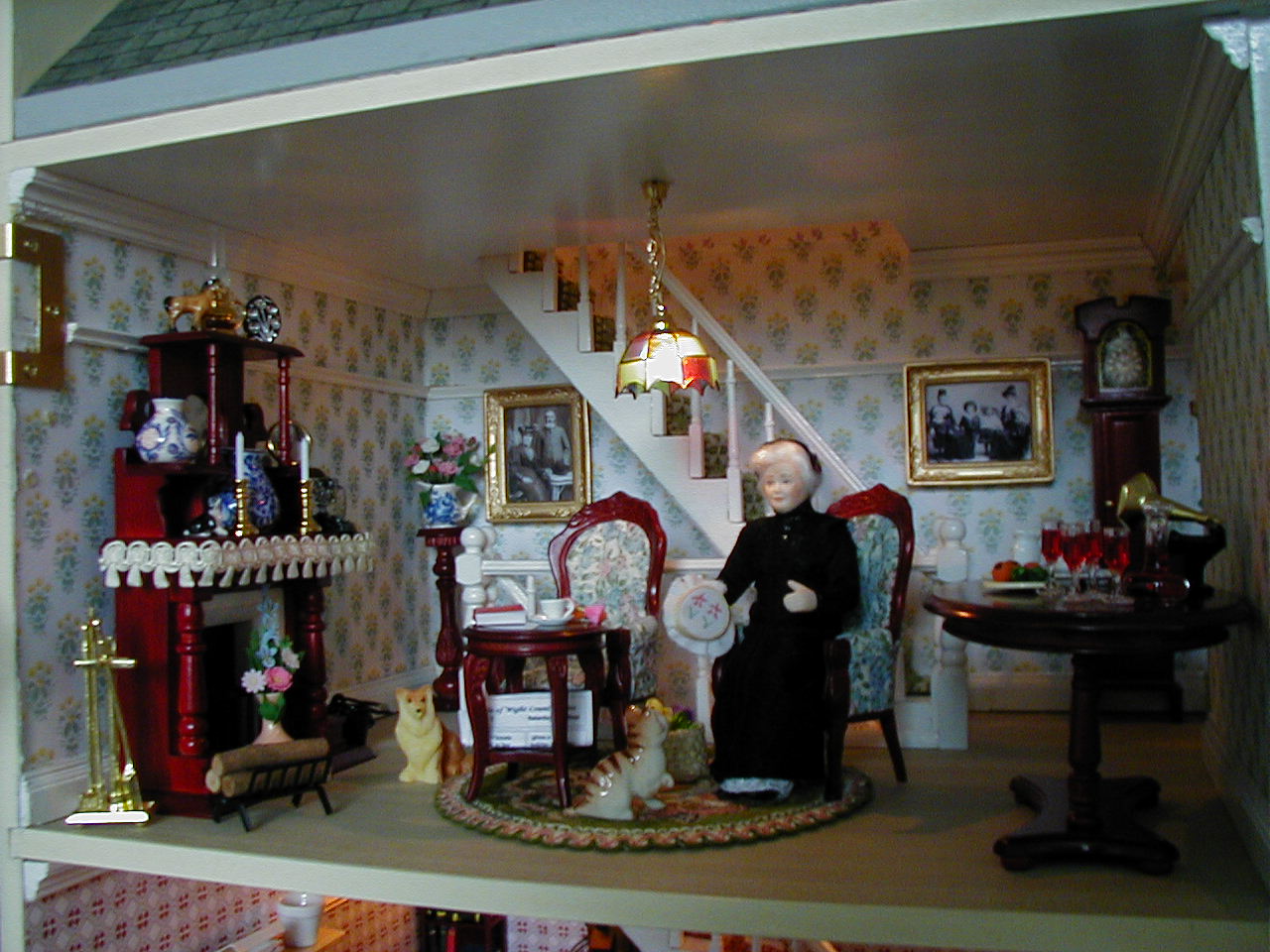 Here is Grandma doing her embroidery, with the cat wanting attention. Miniaturised prints of our Ancestors are on the back wall, even a copy of the Isle of Wight County Press is under the table.